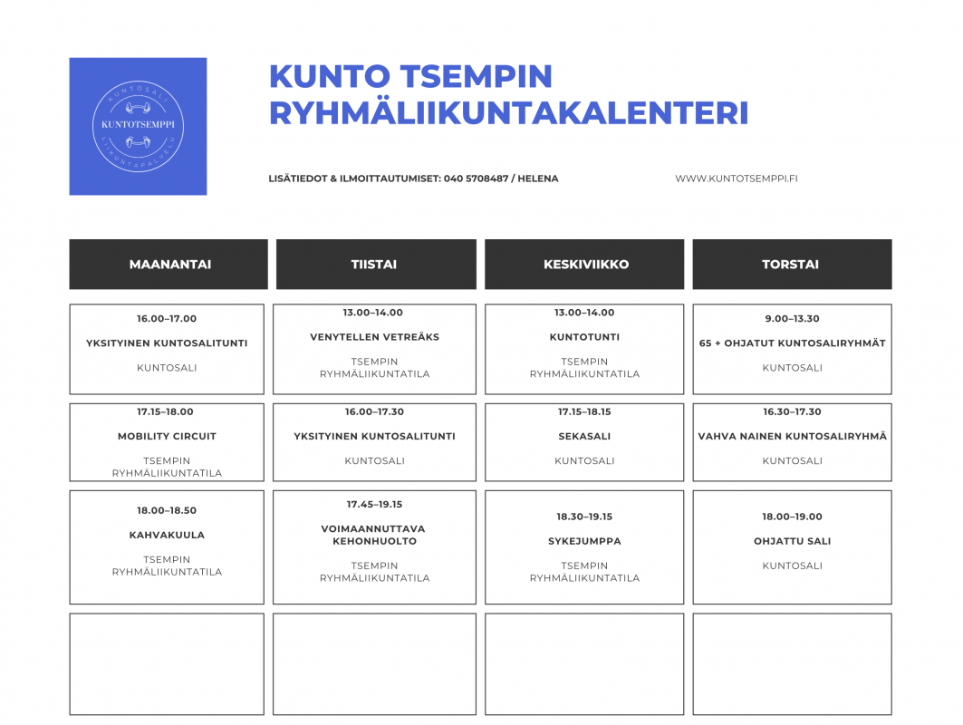 Alta löydät tarkemmat tiedot viikottaisista ryhmätunneista.