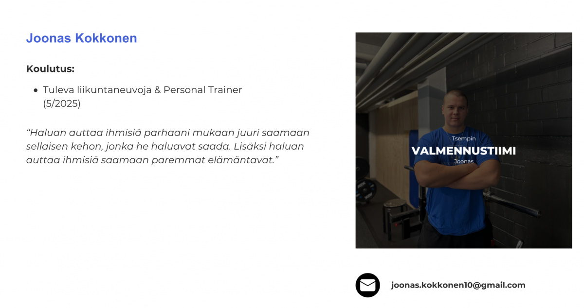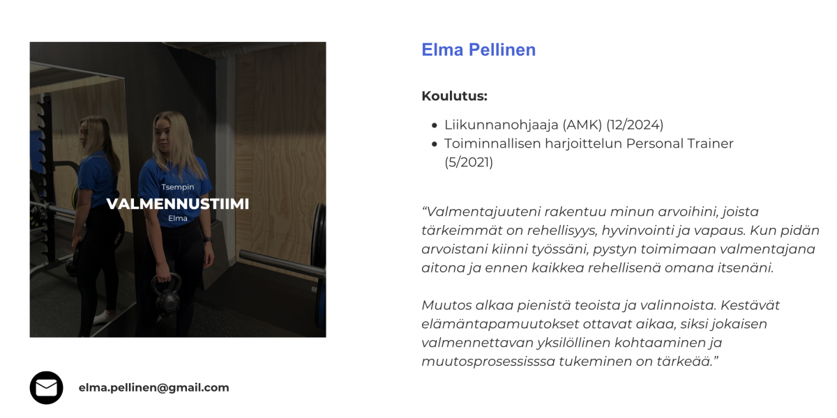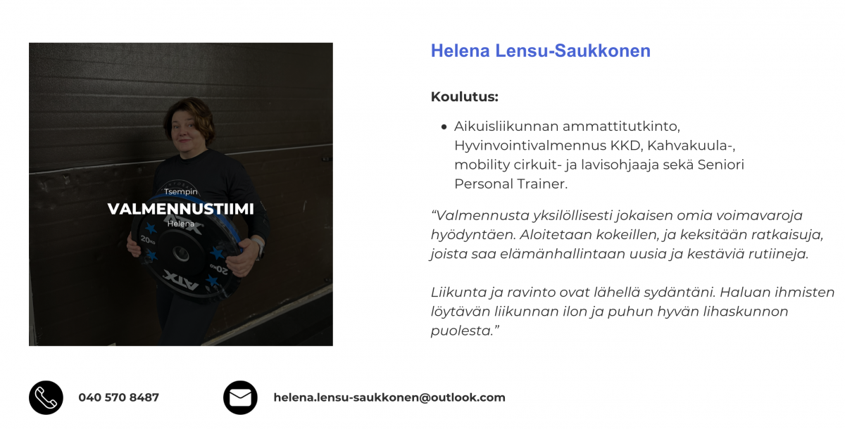 Jos kaipaat apua esimerkiksi treenien suunnitteluun ja toteutukseen, niin siinä tapauksessa tää vois olla siun juttu! Treeniohjelman ansioista tiedät, mitä teet ja kuinka paljon. Yksilövalmennuksen ohjatuissa treeneissä opit oikeat liikemallit ja saat parhaimman tsempin treeneillesi valmentajan kanssa. Elämäntapamuutos ottaa aikaa ja vaatii uusien tapojen opettelua ja toistamista. Valmentajan tuen avulla, saat tsemppiä ja vastauksia kysymyksiisi muutosmatkan aikana.